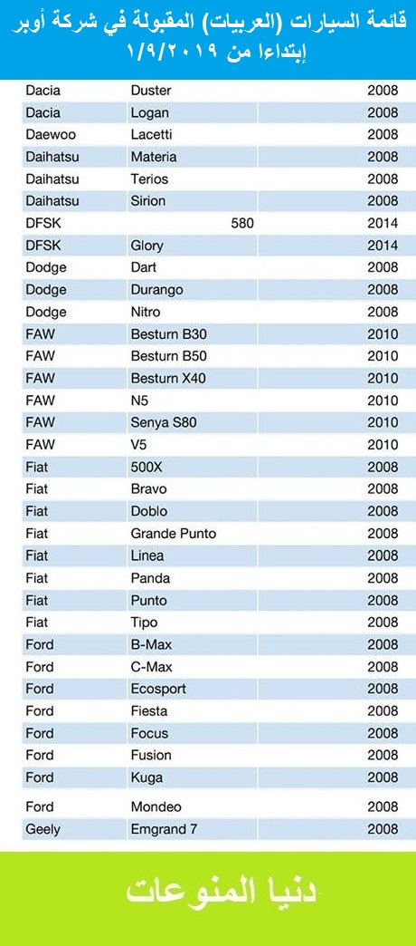 شركة أوبر إبتداءا من 1/9/2019 , وإن إستبعدت العديد من السيارات ذات الموديلات